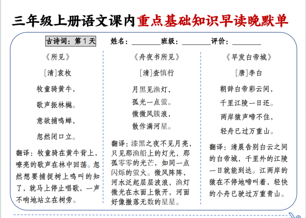 【小学语文】25秋新三上语文课内重点基础知识早读晚默练习单14天(14页)(1)